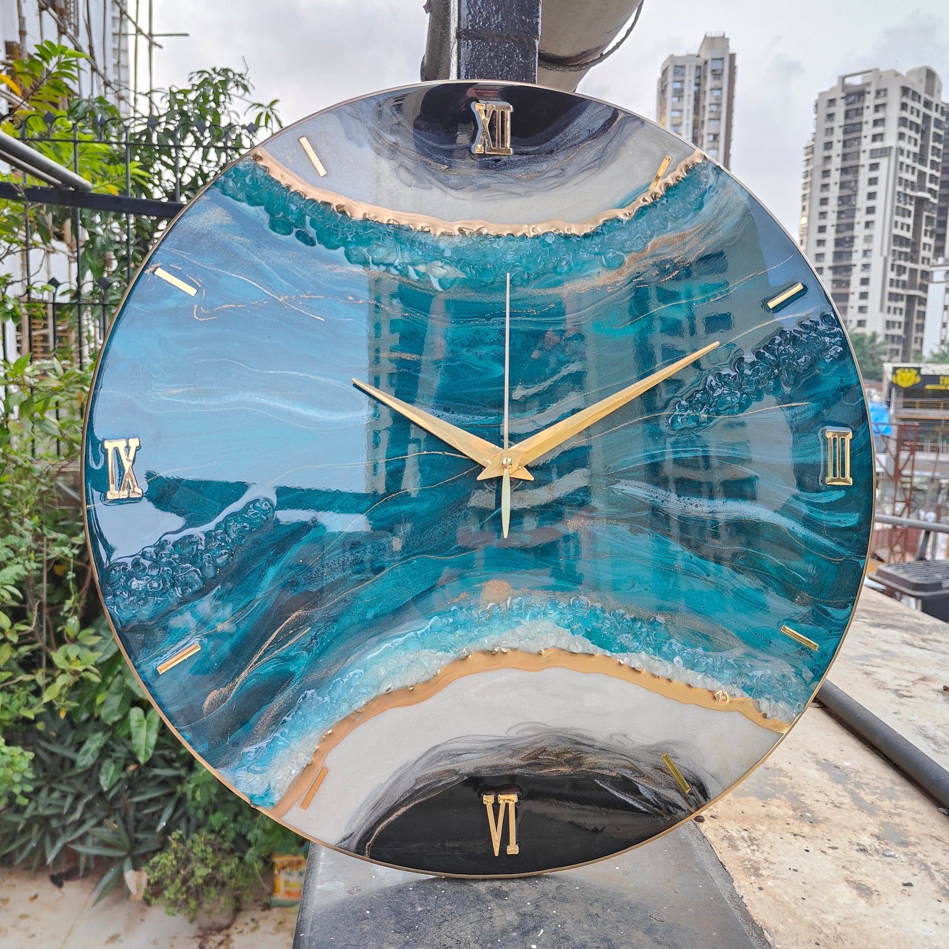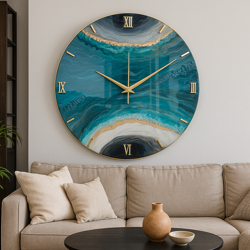 The design draws inspiration from the deep ocean — blending turquoise, teal, and black tones with shimmering gold edges to represent waves meeting the shore. Every swirl and shimmer is hand-poured, making each clock a one-of-a-kind art piece.