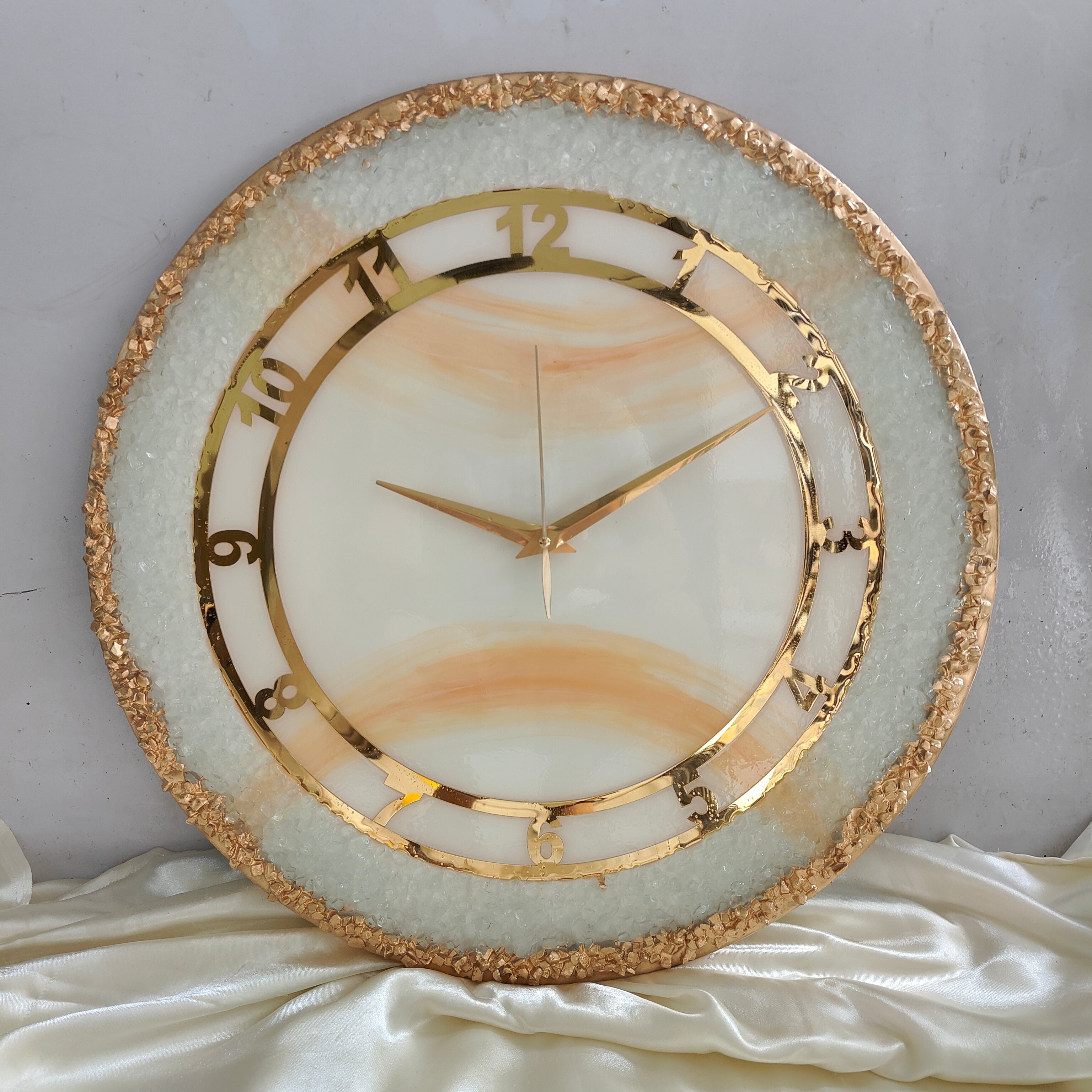 Inspired by the serenity of sunrise hues, this clock blends the calm of peach tones with the luxury of gold. The outer crystal rim adds a sparkling depth, symbolizing balance and prosperity — turning timekeeping into art.