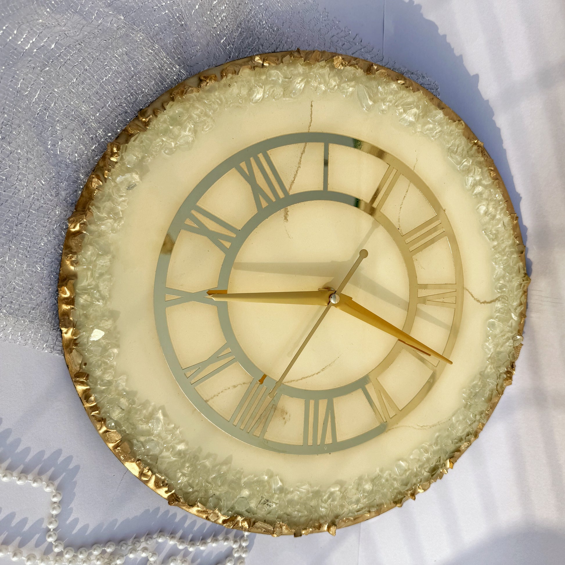 Add a touch of refined elegance to your space with this handcrafted Champagne Crystal Resin Wall Clock. Designed in soothing cream tones with shimmering gold accents and crystal textures, this piece blends modern sophistication with artisanal craftsmanship.