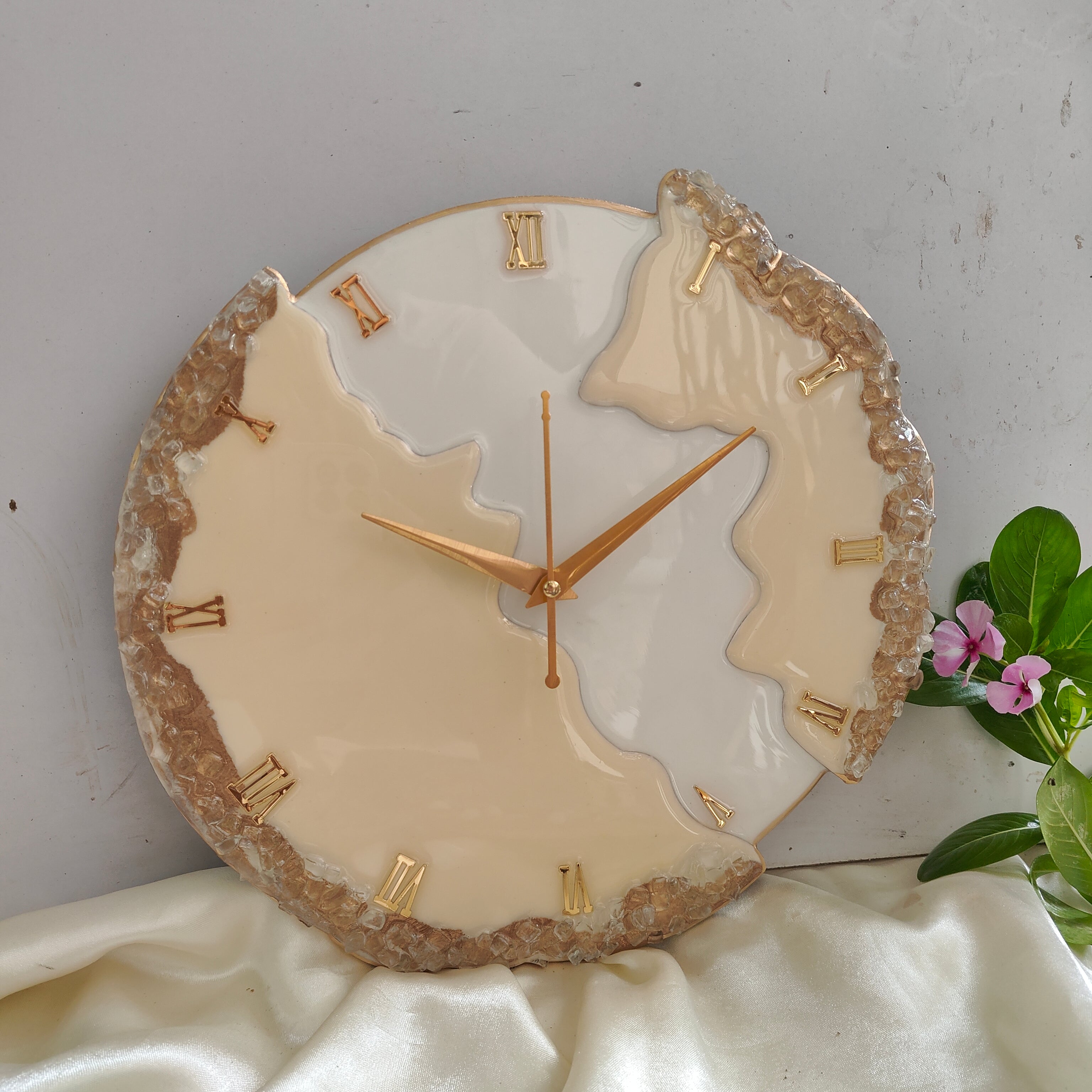 Experience the perfect balance of elegance and art with this handcrafted Dual Tone Harmony Resin Wall Clock. Its flowing beige and white resin blend, gold accents, and crystal edges create a timeless look that enhances any interior space.