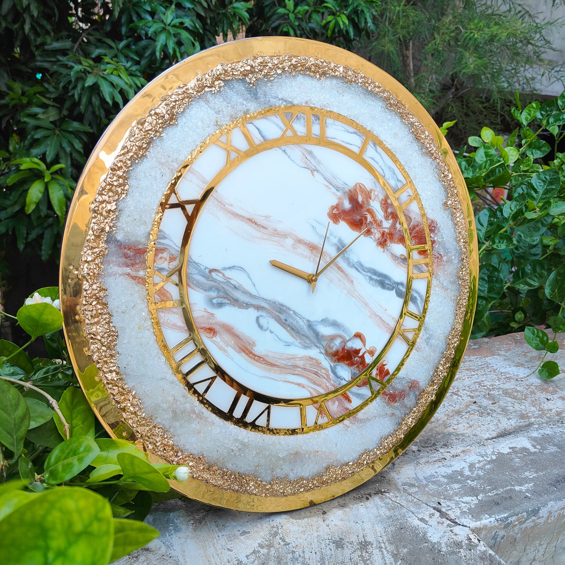 Infuse your space with timeless grandeur through the Imperial Frost Marble Resin Wall Clock, a handcrafted décor masterpiece designed to elevate any interior. Featuring an elegant blend of white marble tones, warm copper swirls, and a radiant gold exterior, this clock embodies sophistication in every detail.