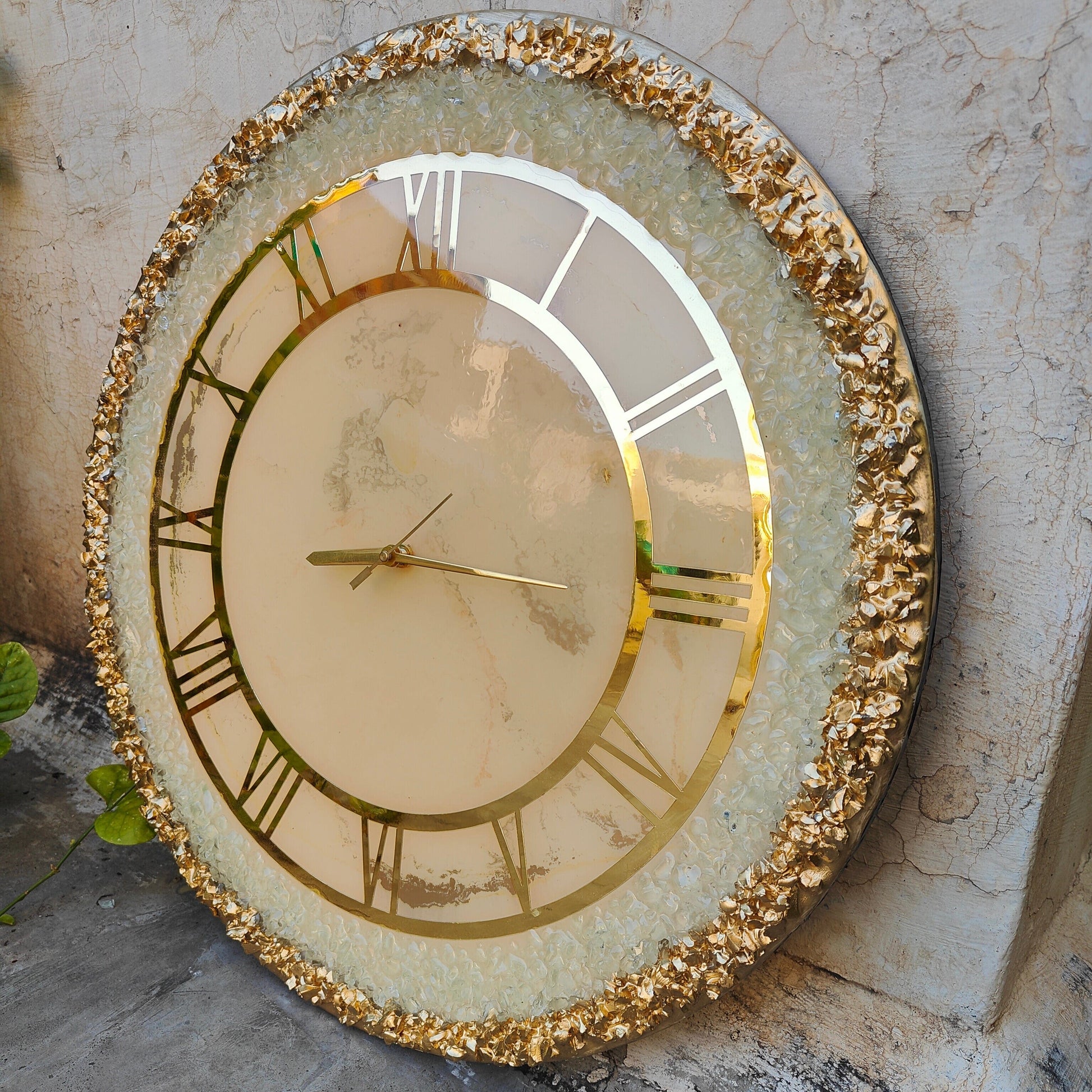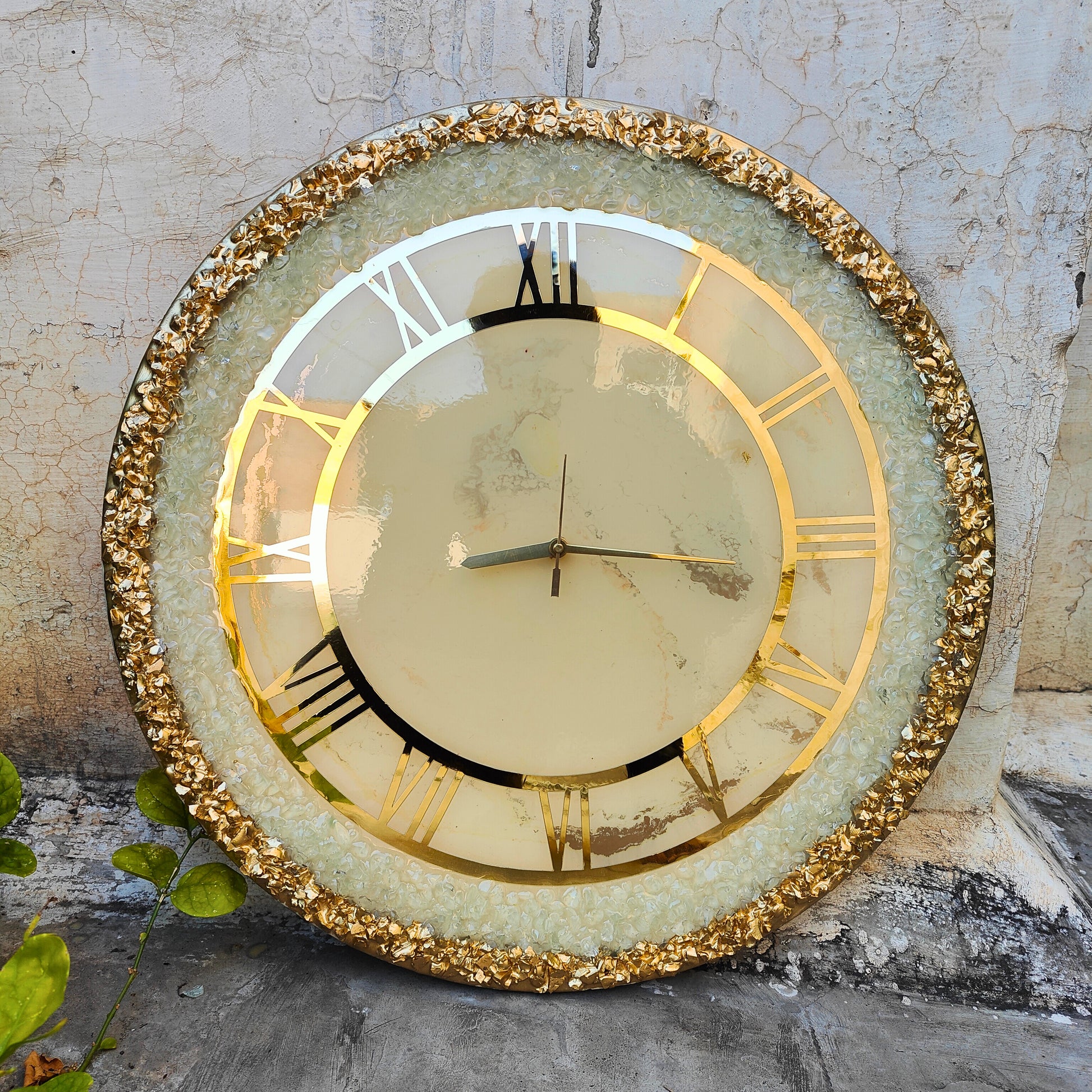 Add an aura of regal sophistication to your space with the Royal Ivory Crystal Crest Resin Wall Clock, a meticulously handcrafted décor piece designed to reflect timeless elegance. Featuring a soft ivory marble center, shimmering crystal textures, and a radiant gold Roman numeral ring, this clock stands as a true statement of refined luxury.