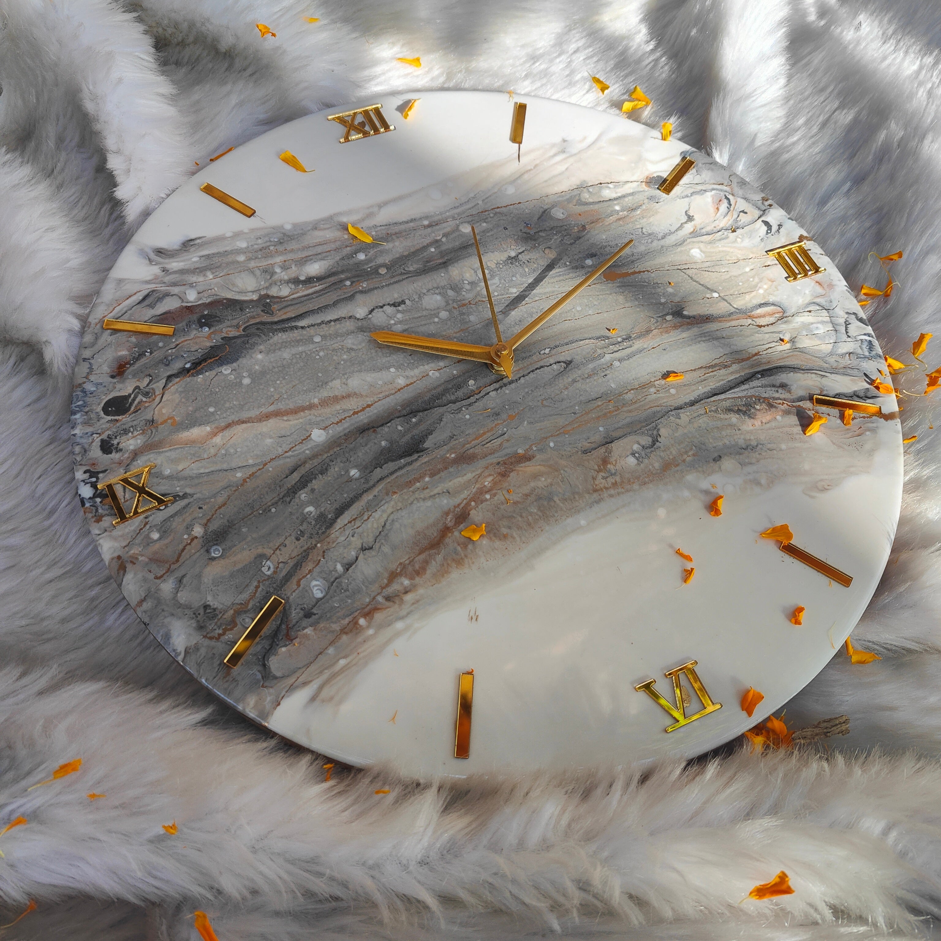 Accented with premium gold Roman numerals and sleek gold hands, every detail is crafted to radiate luxury. The glossy resin surface enhances the depth of the marbling, creating a mesmerizing visual gradient that shifts beautifully with the light. Subtle splashes of orange petals add a gentle, organic contrast—capturing the harmony between art and nature.