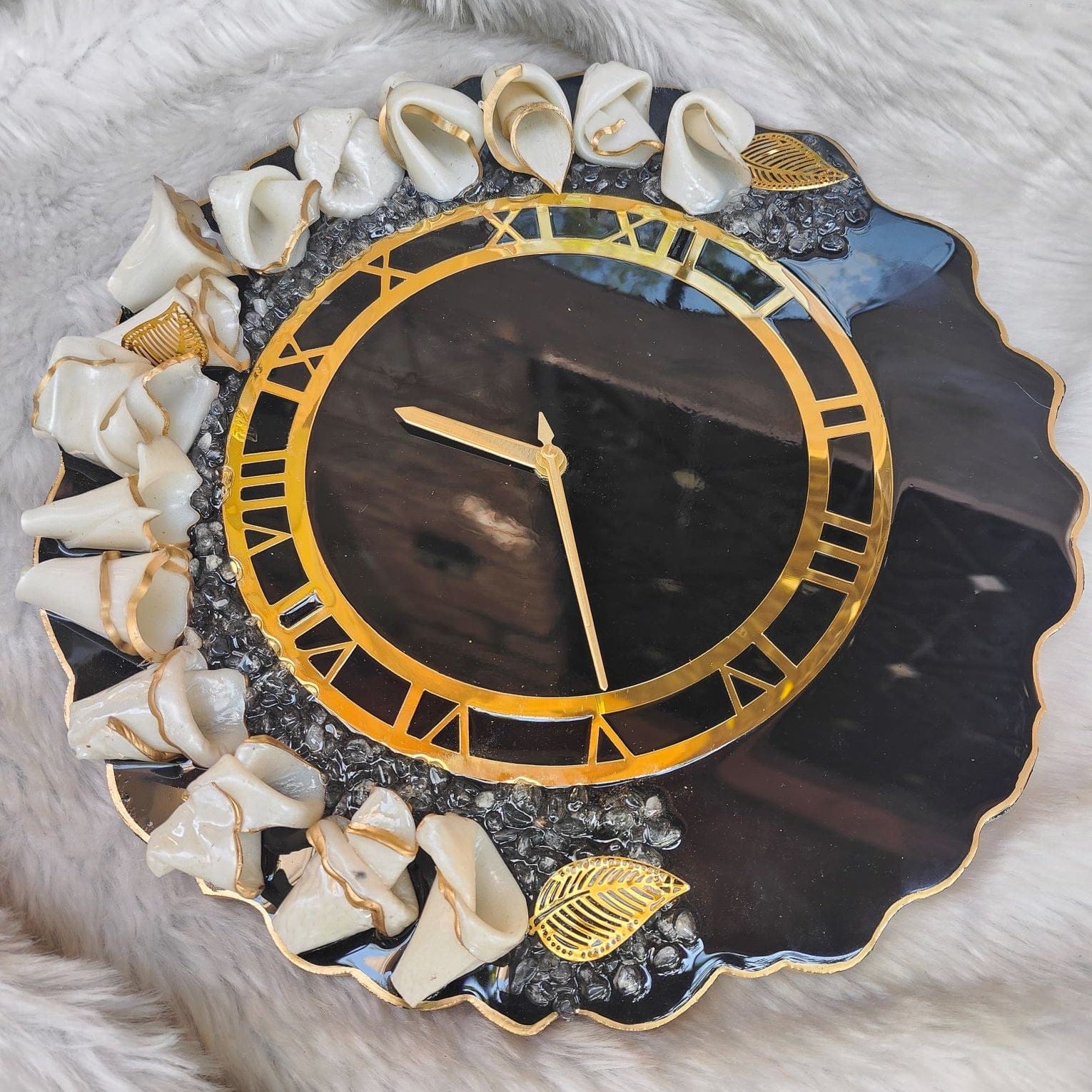 Elevate your interiors with the timeless elegance of the Luxe Noir Petal Aura Resin Wall Clock, a handcrafted masterpiece that blends bold sophistication with artistic detailing. Designed for luxury lovers, this clock stands out with its deep black glossy base, radiant gold Roman numerals, and opulent handcrafted resin petals.