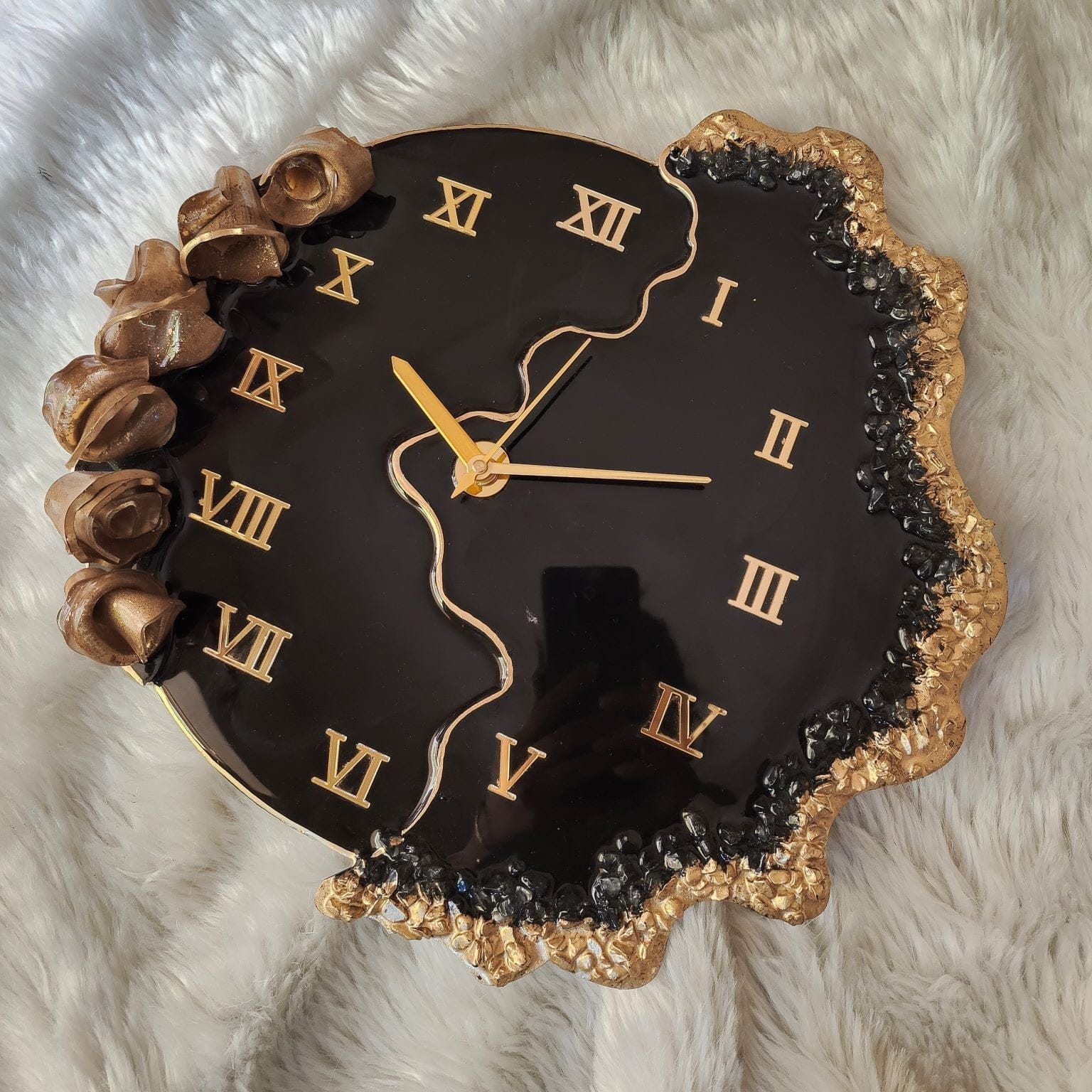Elegant gold Roman numerals and sleek gold metal hands stand out vividly against the dark resin backdrop, ensuring both readability and refined style. Every curve, sparkle, and sculpted detail is meticulously crafted, making this clock not just functional—but a bold artistic centerpiece.