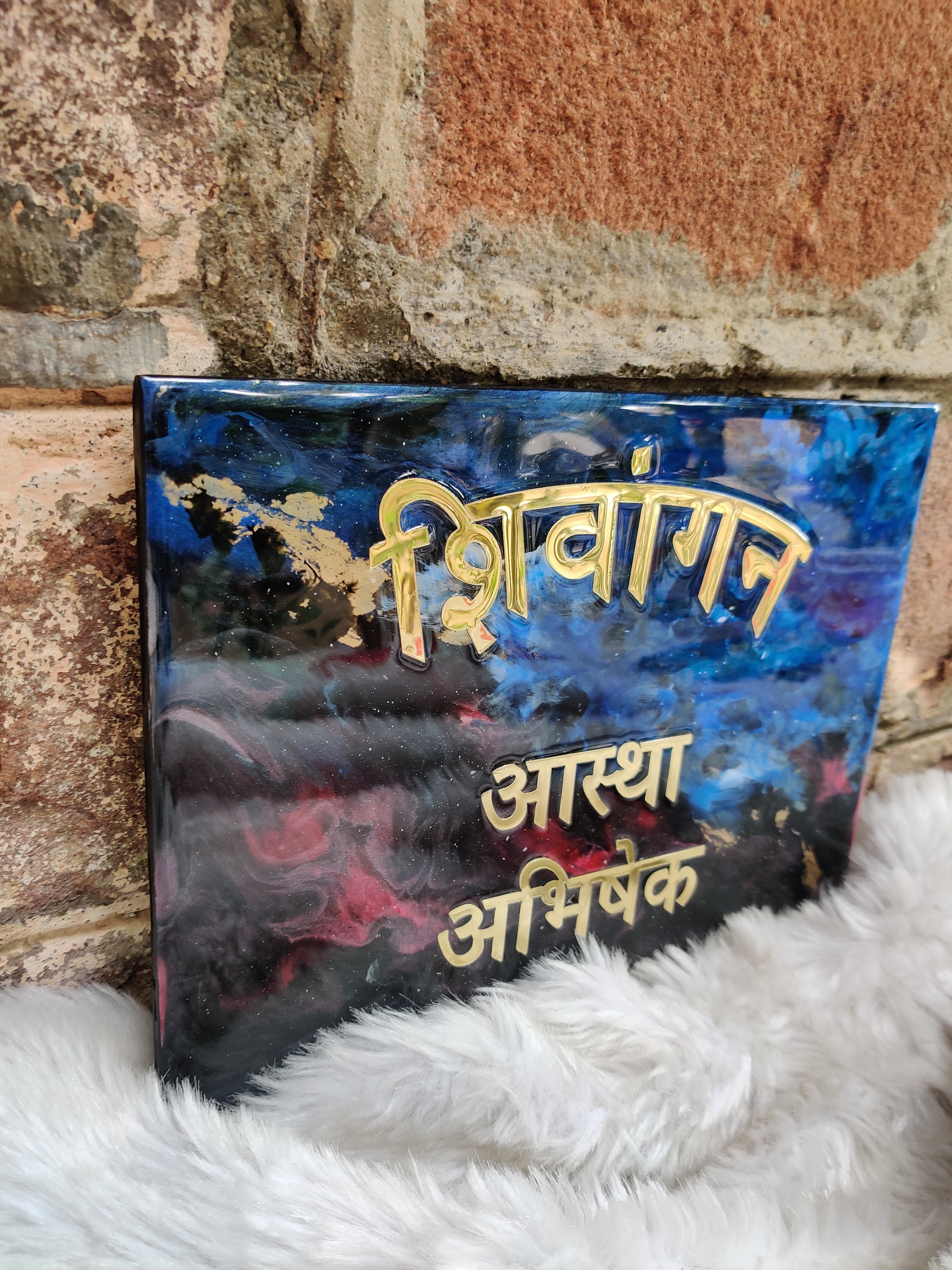 Celebrate your identity with this artistic Cosmic Aura Resin Nameplate, handcrafted with deep cosmic resin tones and gold Hindi lettering. Its rich colors and spiritual essence make it a striking statement piece for your home entrance.