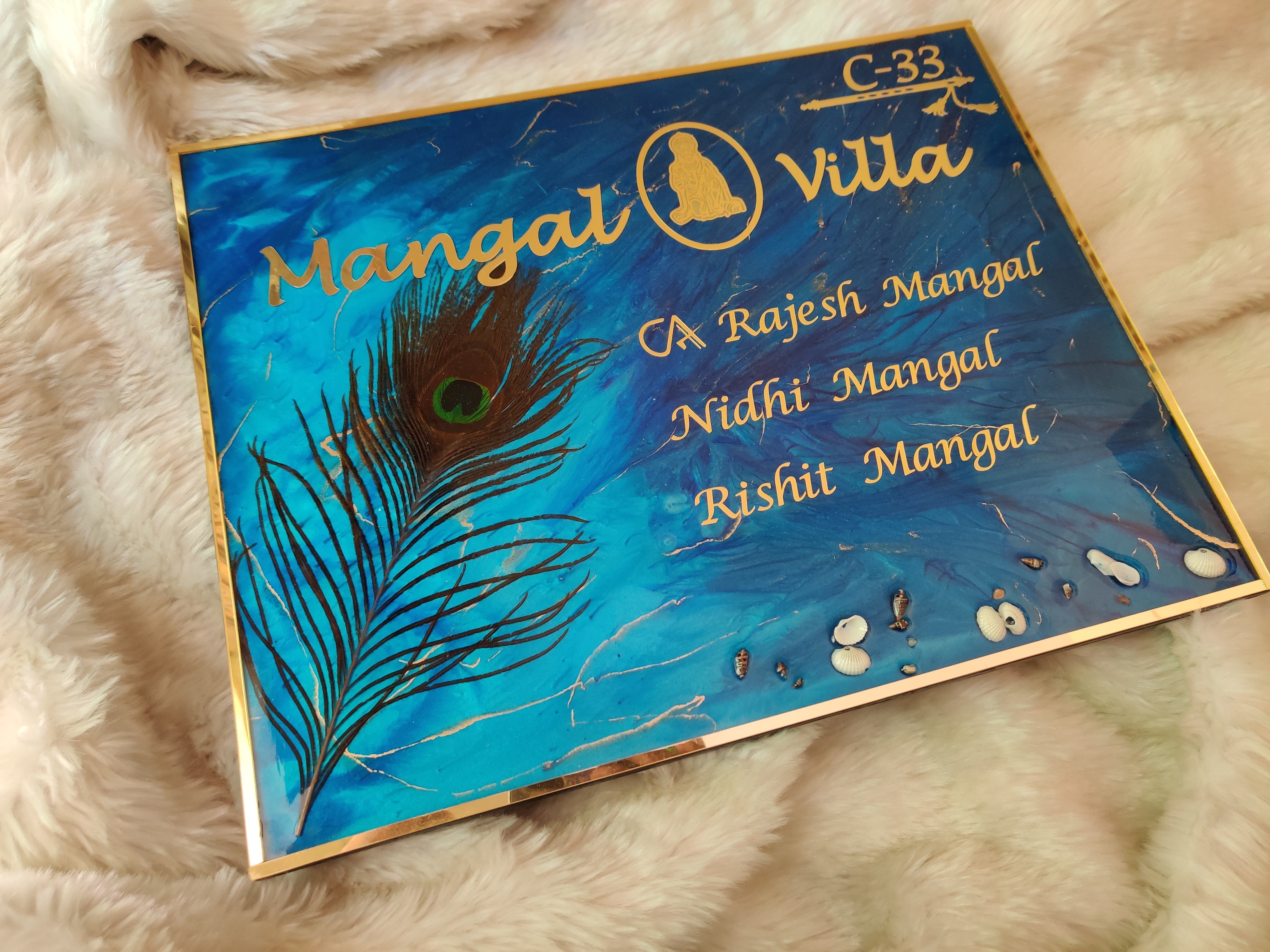 Bring elegance and positive energy to your entrance with this handcrafted Peacock Feather Resin Name Plate. The soothing blue resin tones, real peacock feather, and gold accents create a luxurious and spiritual statement piece perfect for any home or office.