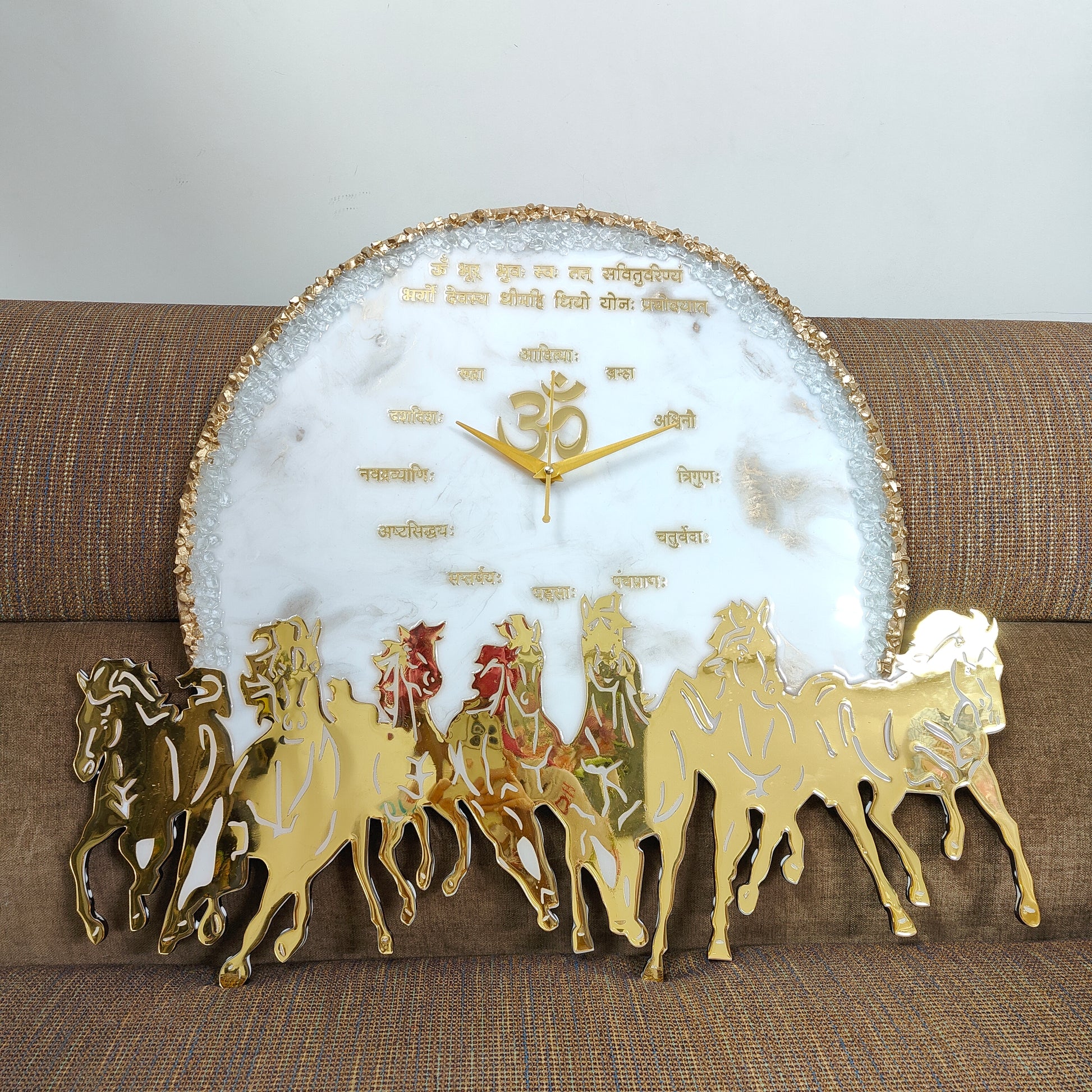 Bring home prosperity, strength, and timeless beauty with this handcrafted Seven Horses Divine Aura Seven Horses Om Resin Wall Clock. Designed with exquisite detailing, this elegant piece combines spiritual symbolism with modern craftsmanship.